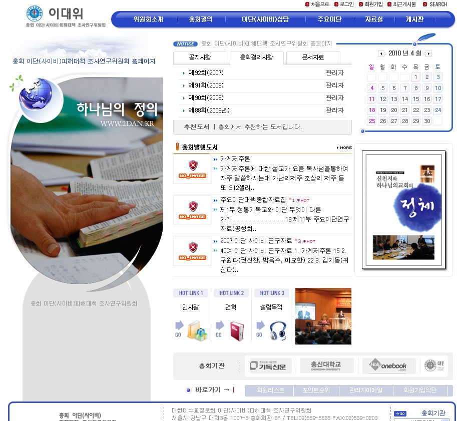 소개, 총회의결사항, 사이비 제보 및 상담 안내, 영상자료 수록.